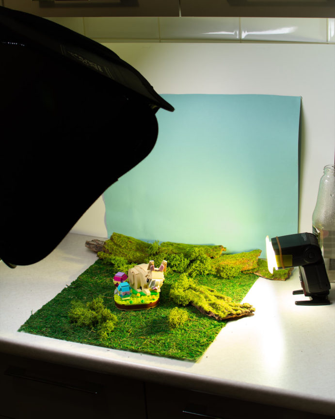 I usually photograph LEGO in my kitchen, and this review is no exception. This is what my workplace looked like on the day of the shoot. I decided in advance that my Easter bunny should be shoot on a green lawn, but since it is very snowy and frosty outside my window, I went to a hobby store to find something for suitable scenery
