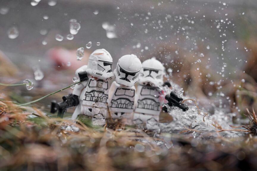 For this shot, I used a water spray and poured some water around the figures. When taking multiple photos, it’s possible to overlay the images, selecting carefully which parts of specific shots are to kept in the final image.