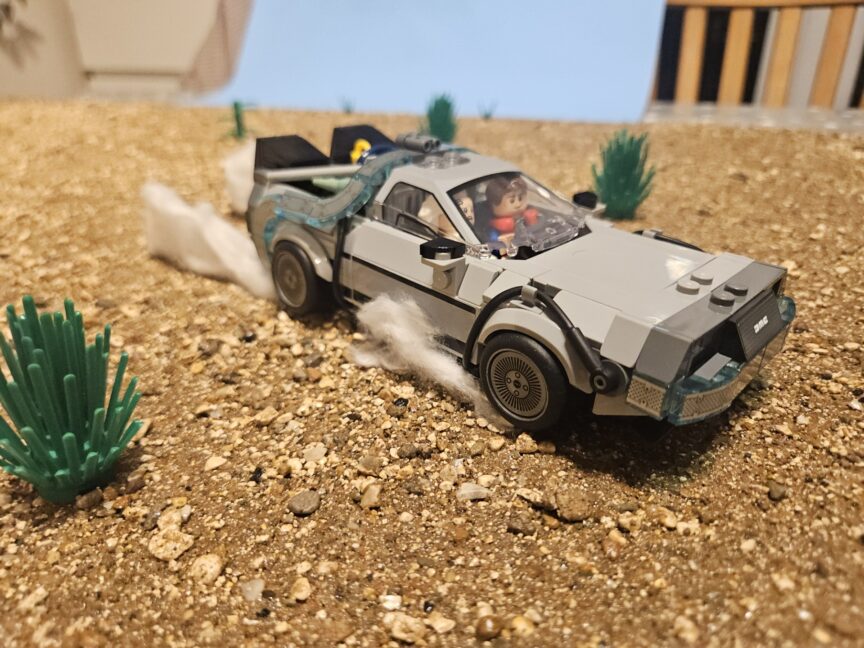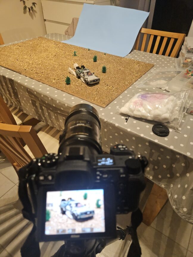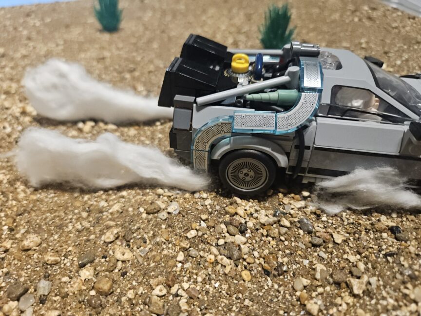 I then used some Lego shrubs to scatter around the scene to make it look like an arid desert. I also wanted to make it look like the Delorean was going at speed so I decided to use some cotton wool for the first time; to create dust clouds and i honestly cannot believe I have never used them