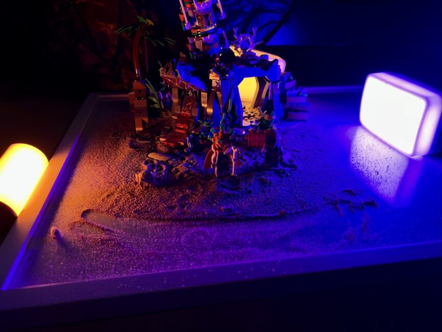 For this beach scene, I used a print frame as the base, which is ideal to keep the sand in place. The reflective surface of the frame helped create a subtle water effect next to the sand, giving the shoreline a realistic look. I used three lights to shape the scene. One light was placed behind the cave to highlight the entrance and suggest there was light inside. A second light from the left emphasized the lava from the dragon’s mouth and illuminated the character. The blue light on the right created the night atmosphere.