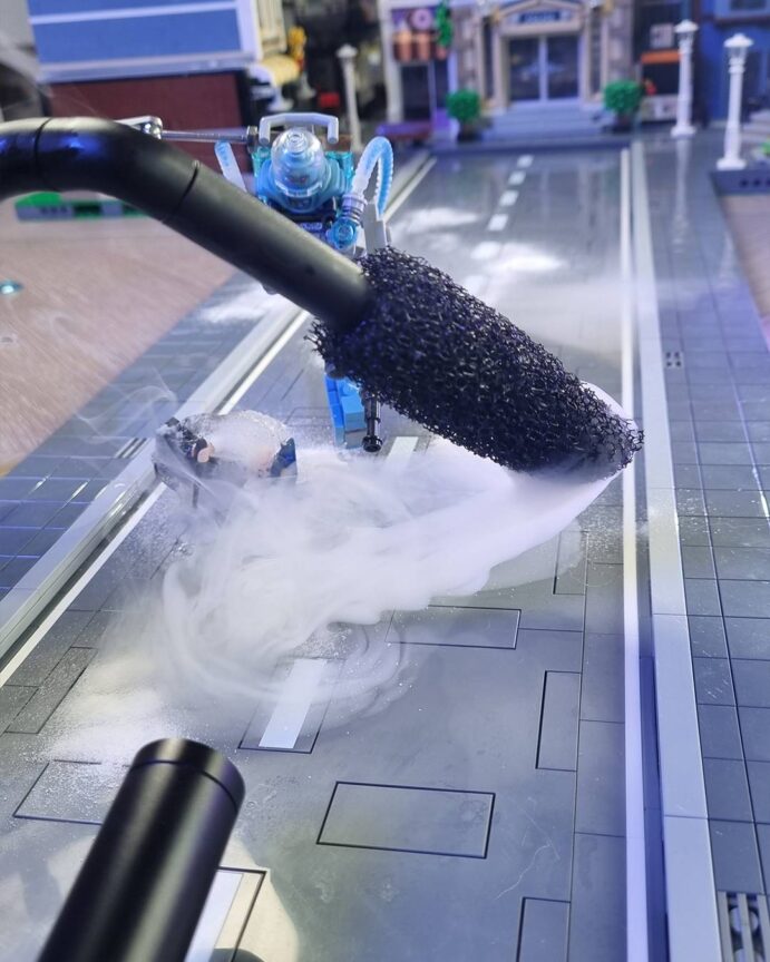 I like to use an external monitor attached to my camera to be able to set the scene up to frame, without needing to constantly head back to the camera to check the viewfinder. This is especially useful when using the probe lens, as the camera is so much farther away. To create a touch of snow and ice in the streets, I sprinkled some baking powder and used my Smoke Ninja to create a subtle haze along the ground.