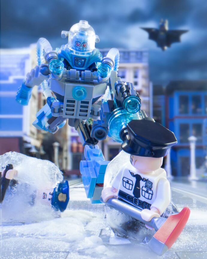 Since the recent announcement of our upcoming game, I’ve been in a bit of a Batman phase. So, my idea was to create a scene of Mr. Freeze’s reign of terror through the streets, as Batman looms in the distance – alluding to Freeze’s impending defeat. Mr. Freeze and his mech are from set #70901 Mr. Freeze Ice Attack.
