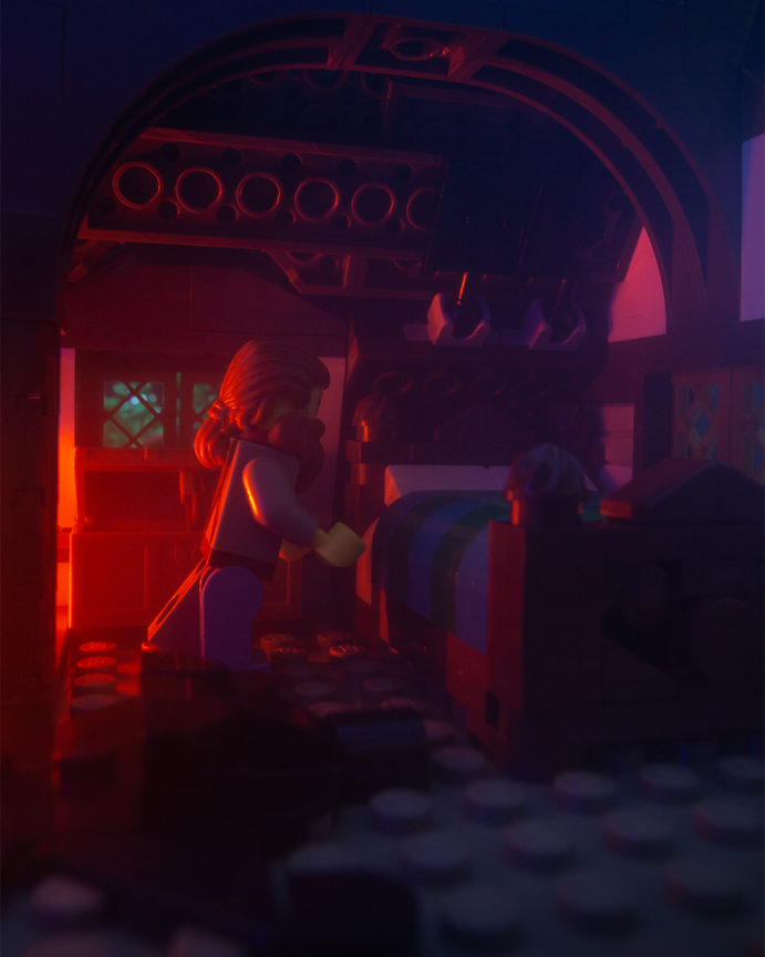 For both the day and night wide shots I set up in front of a large TV screen to get the screen’s light and color bleed on the edges of the Lego elements.