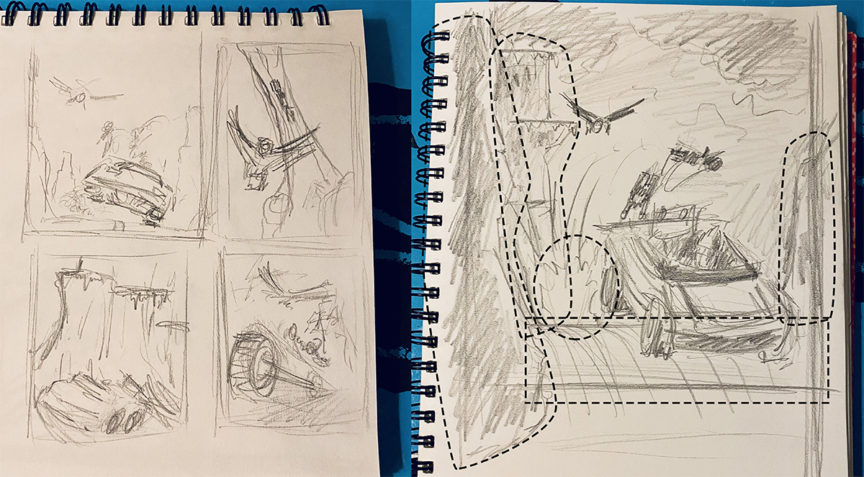 My motivation was simple: I wanted a really cool chase scene! But if you know my style I like to build everything out of LEGO so I had to be pragmatic with the layout as well. I started with a series of quick thumbnail sketches and fairly quickly gravitated towards one concept that was both dynamic and economical build-wise.