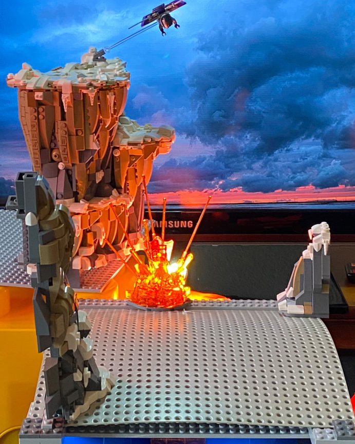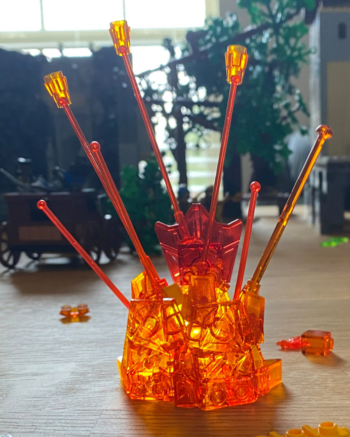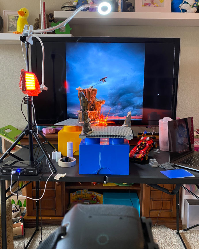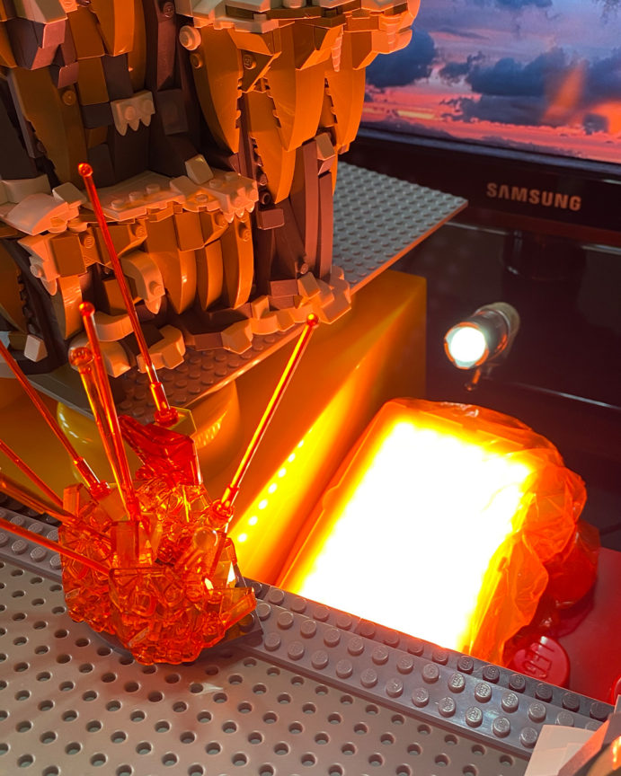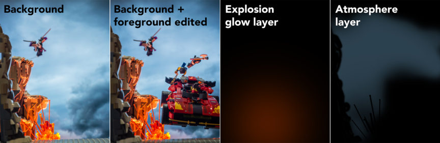 To get the explosion lit up I used two lights; one panel light with orange gels and diffusion to get the ambient color for the set and one small flashlight (torch) to hit the trans orange LEGO pieces and light up the actual explosion. A small orange bulb placed behind the explosion would have also worked (possibly even better) but I did not have anything suitable.