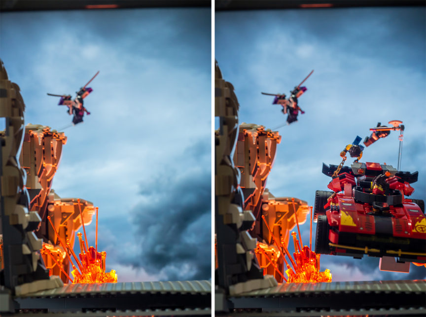 The secondary light source in this scene is defined by the sky. It appears that whatever sun light is coming through is coming from the top left. To match this type of diffused light I used a combination of ambient daylight coming in from windows on the left side and a small ring light top left to hair light the minifigs and rock structures.
