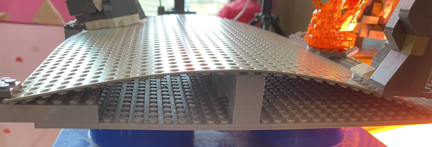 The road was actually a very critical piece to making this concept work. The only way to include the road the way I drew it in the thumbnail was to have a curved surface. To do this I took an old grey 32×32 base and curved it over a center support and clamped the two ends down with plates.