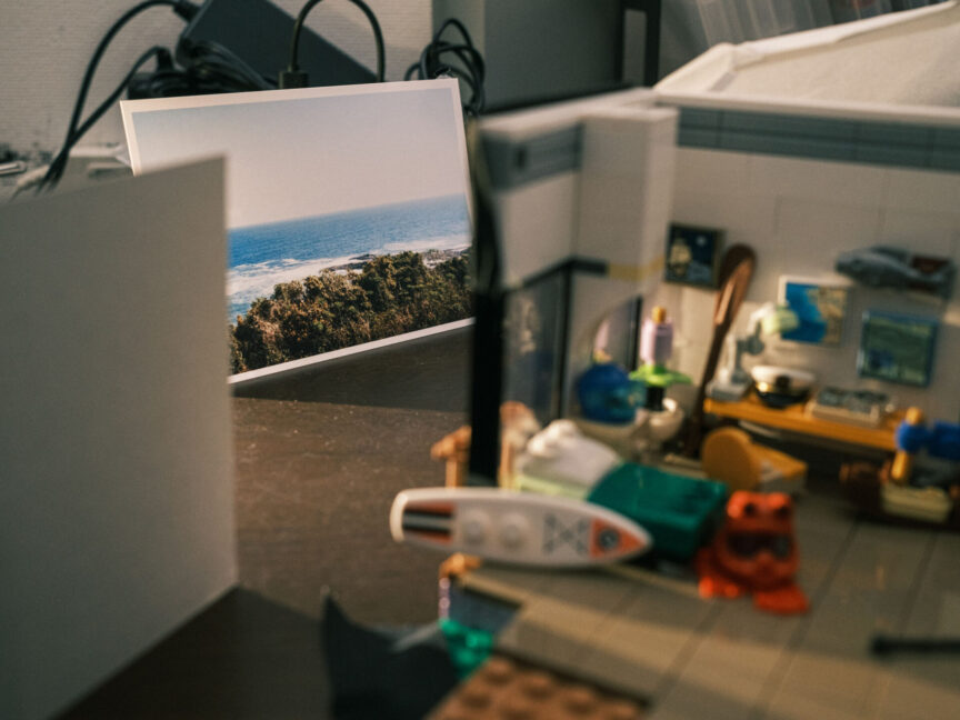 I didn’t dare to use the minifig, but shot scenes that inflated my imagination, such as fishing gear, maps, and snorkels. The sea you can see outside the window is a printed photo.