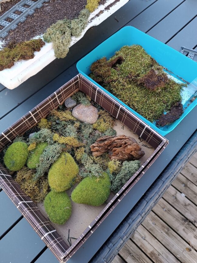 Here are some pieces of moss that I easily find in the forest. I keep them for months. The advantage? They are reusable even when dry and give a realistic look. I add some artificial elements that can be found either in the modeling section of toy stores or in the nursery section at Christmas time.