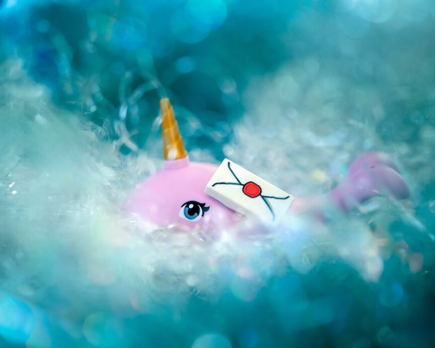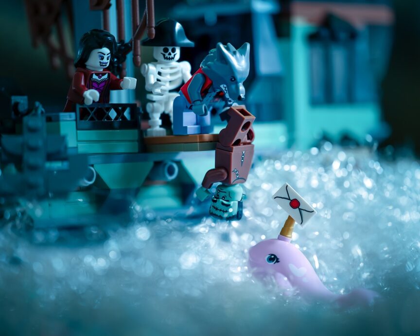 For the scenes with the ghost ship, I wanted to try something new this time. Creating water using only the bokeh effect. For the background, I laid out blue cardboard and scattered a glittering garland and tinsel on top, which usually are used as Christmas decoration. Reflectors on both sides of the scene directed the light. The scene was actually lit with daylight, as the table is located near a window. Only an LED balloon light was used in the background of the scene. By changing the camera’s white balance to artificial light, the shots got a bluish, ghostly look, which I later enhanced during editing. But the bokeh effect in these images could not be achieved in just one shot. I took several pictures, focusing each time on different near or far spots in the scene. I then combined these in Photoshop using layer masks so that the blur became visible everywhere it should be.