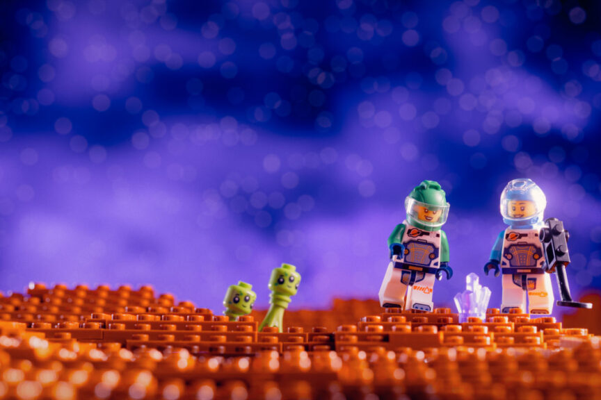 However, I was able to vary, particularly in the sequence that takes place in the rift. I wanted a different, warmer atmosphere, like in a rocky cavern. For these images, I used continuous light instead. The cave is created with sand, rocks and a kraft bag for the background. I used an old Lego ship as a nod to the old space themes of my childhood (set 6884).