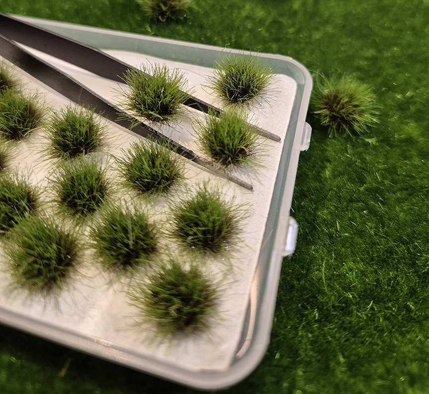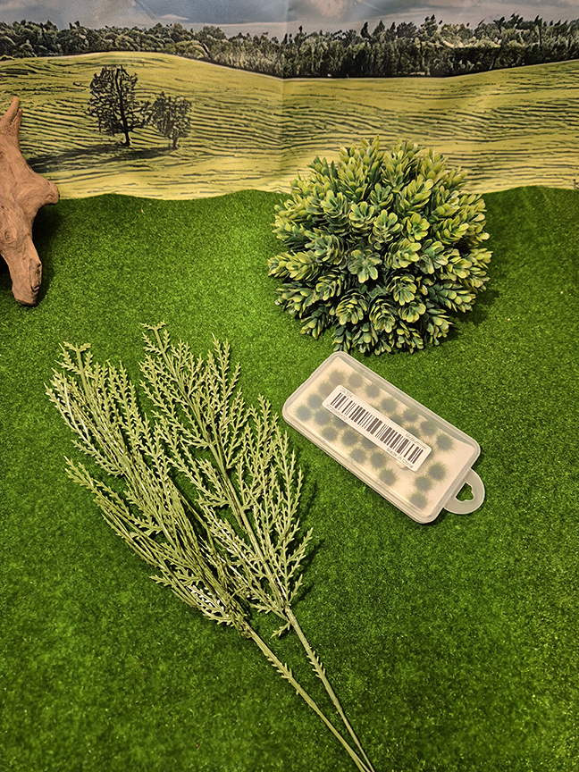 After you placed your background, the grass is added. I used green felt for decoration (fake Easter grass). The next step is adding branches, some artificial plants, a few Lego flowers and the newest addition to my toy photography props – grass tufts. I really like them, because they match the size of the minifigures.