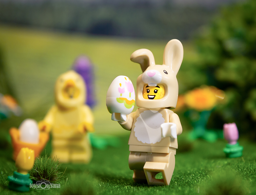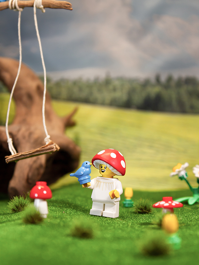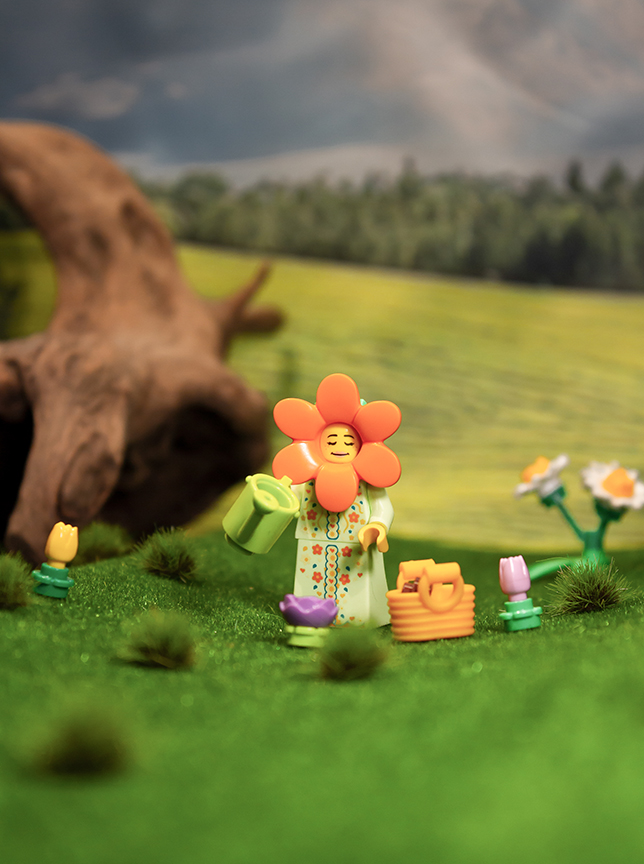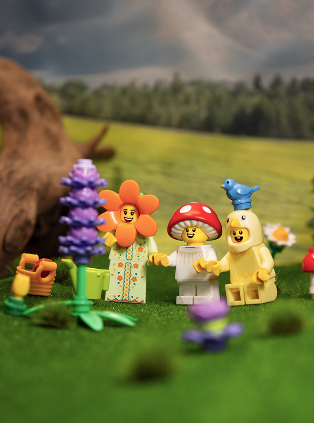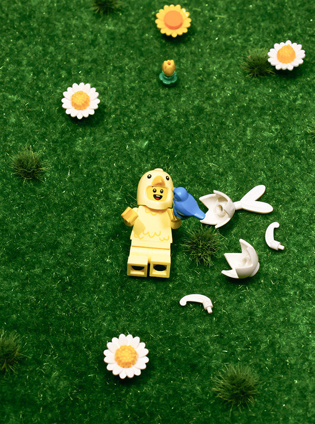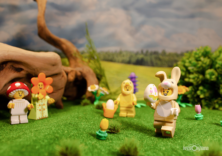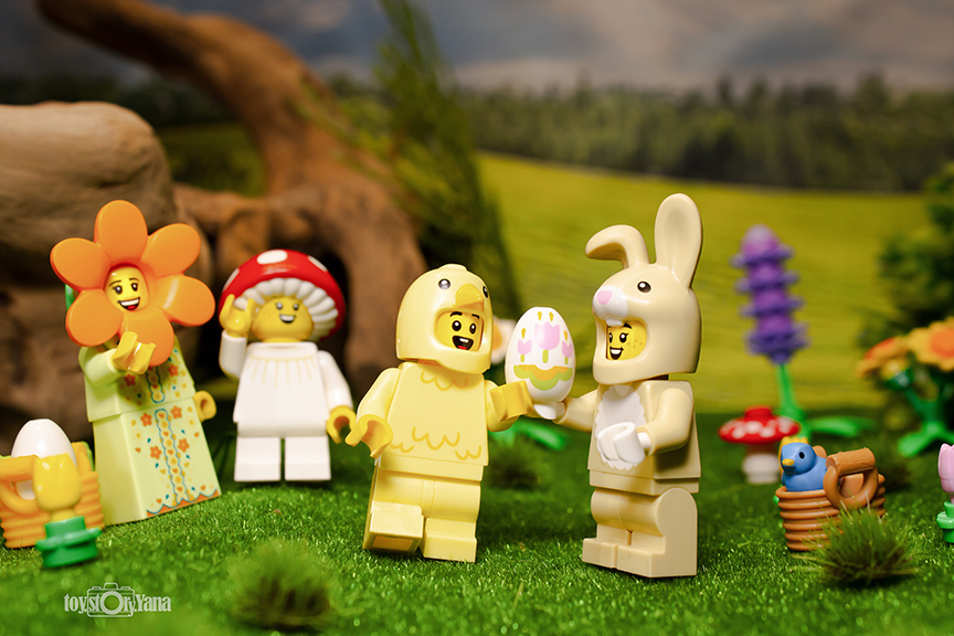 As we previously wrote, LEGO released 3 new minifigures in the Build – A- Minifigure section on March 1st. Just on time for our spring photos! We have a cute mushroom girl with a blue bird, a chicken boy costume with a basket, and a a flower lady with a beautiful green dress and a watering can. They are fun minifigures and what I find interesting in them is I can recognize their heads from older sets. The chicken costume boy has the same head as one of the elves from 10339 Santa’s Post Office. The mushroom’s head is actually the same as the cute bunny from the new CMF 28 series. And I recognize the flower lady from the old 60283 Holiday camper van set.