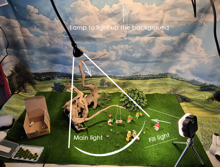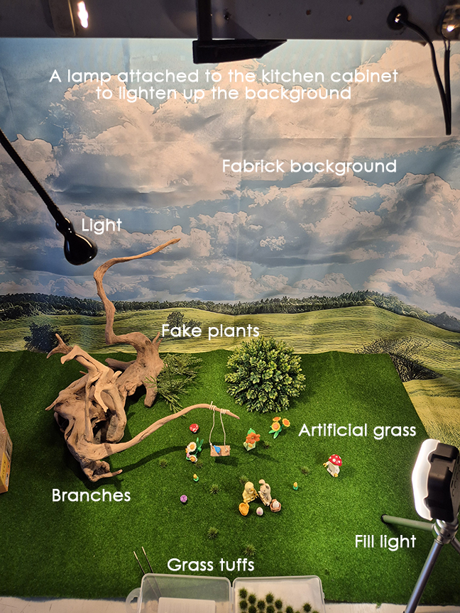For this scene, I arranged everything on the kitchen counters. First I set up the background, and since it’s a long printed fabric, I put everything on top of it. I settled it to the wall using tape. Of course you can use a plain blue cardboard for sky, or a sky poster for your background.