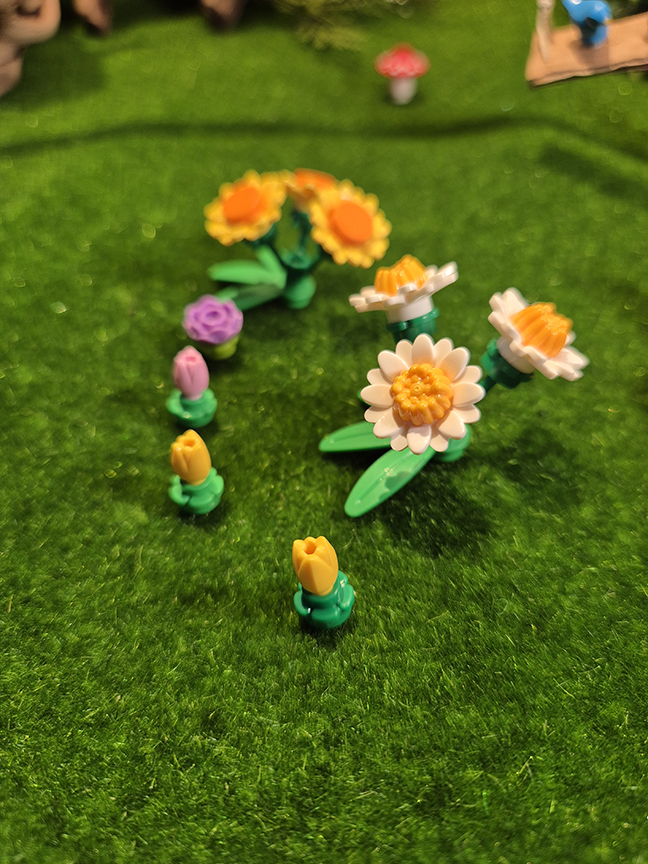 After you placed your background, the grass is added. I used green felt for decoration (fake Easter grass). The next step is adding branches, some artificial plants, a few Lego flowers and the newest addition to my toy photography props – grass tufts. I really like them, because they match the size of the minifigures.