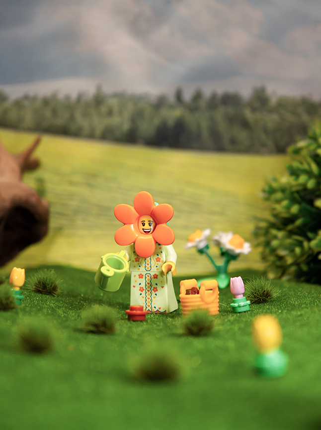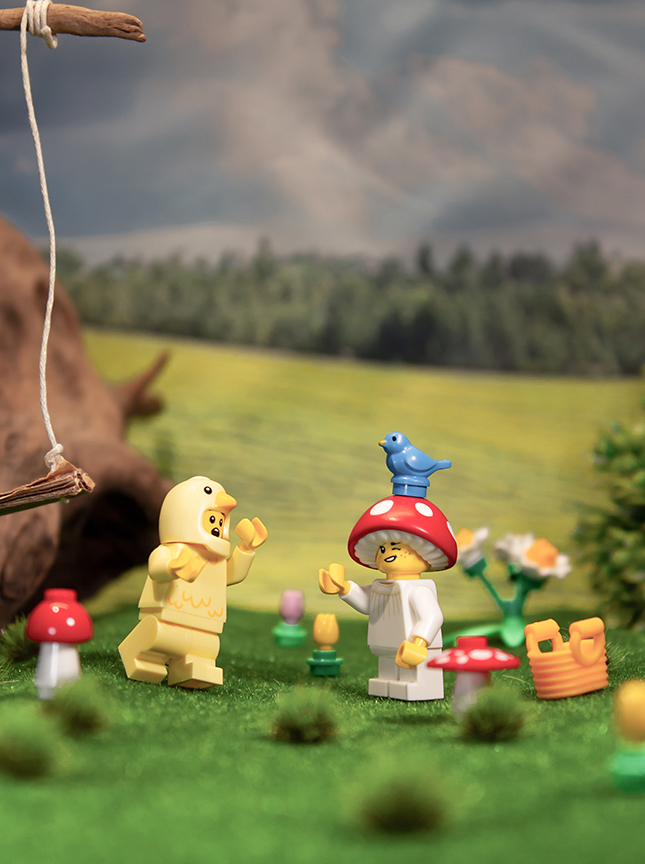 As we previously wrote, LEGO released 3 new minifigures in the Build – A- Minifigure section on March 1st. Just on time for our spring photos! We have a cute mushroom girl with a blue bird, a chicken boy costume with a basket, and a a flower lady with a beautiful green dress and a watering can. They are fun minifigures and what I find interesting in them is I can recognize their heads from older sets. The chicken costume boy has the same head as one of the elves from 10339 Santa’s Post Office. The mushroom’s head is actually the same as the cute bunny from the new CMF 28 series. And I recognize the flower lady from the old 60283 Holiday camper van set.