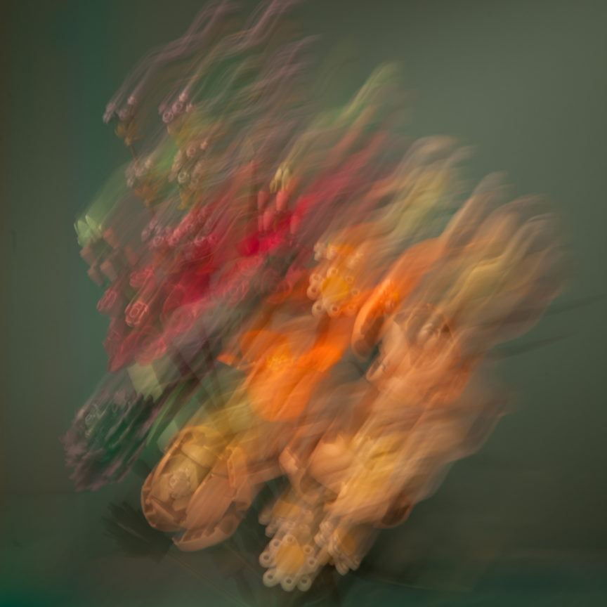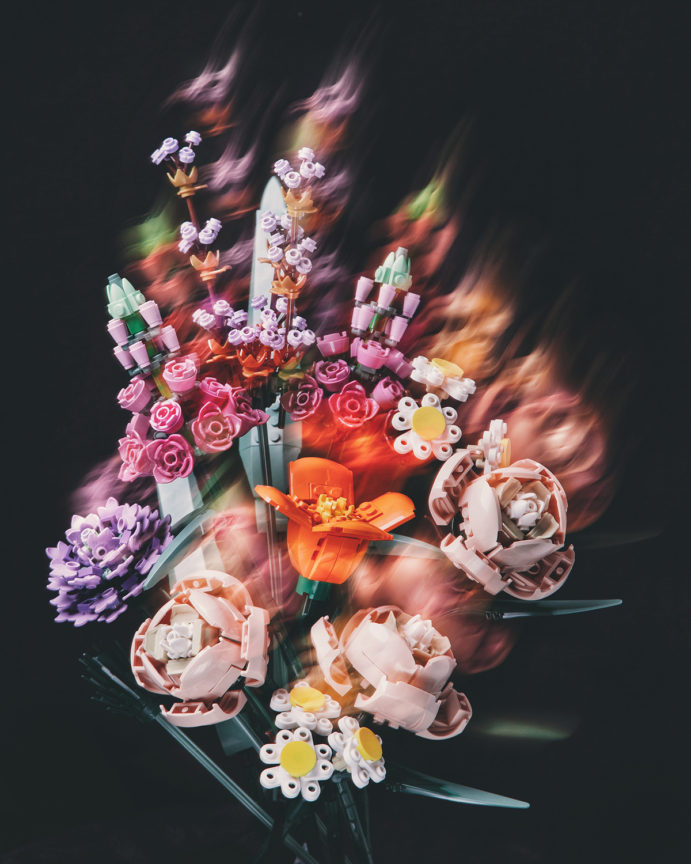 The Flower Bouquet was a tricky object to photograph: I found myself battling with some parts of the blooms falling off while trying to arrange all the flowers into a perfect composition. Lots of reflections were flaring from every flat and curved surface. That gave me the idea to create a long exposure with motion effects by moving my camera while shooting.
