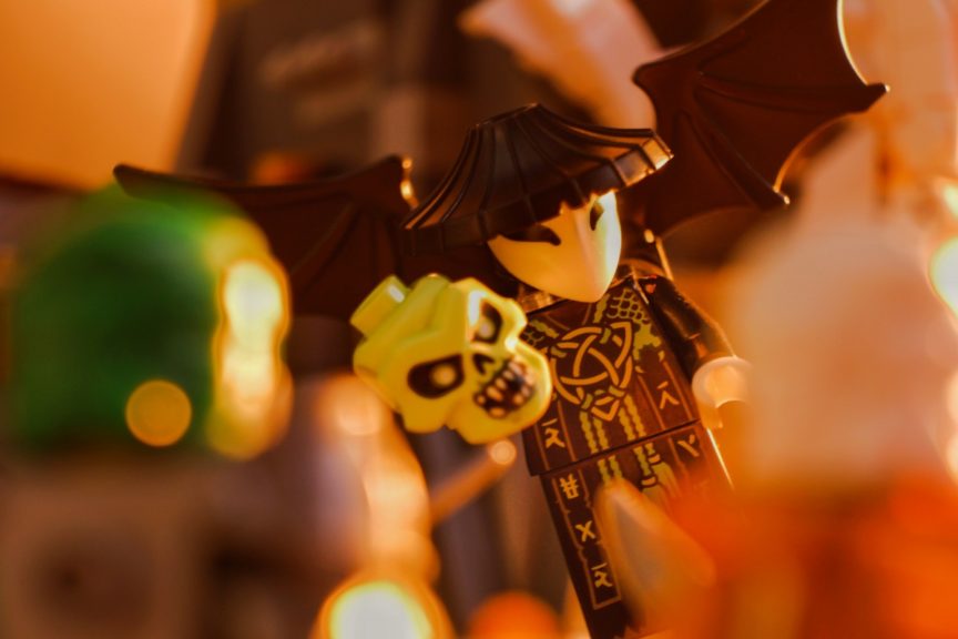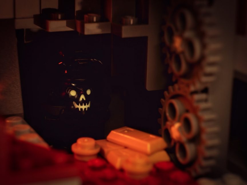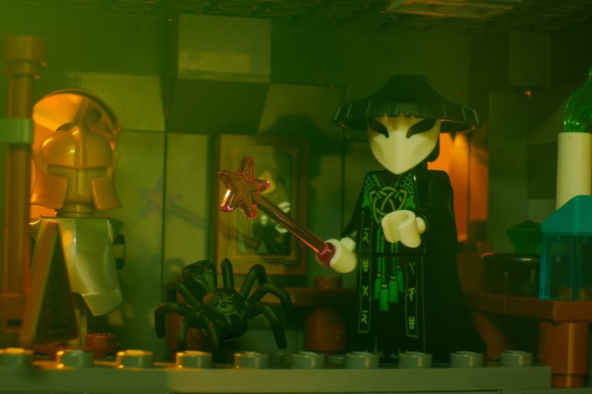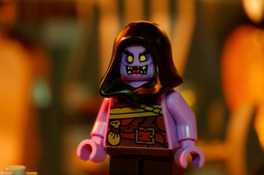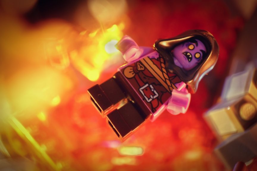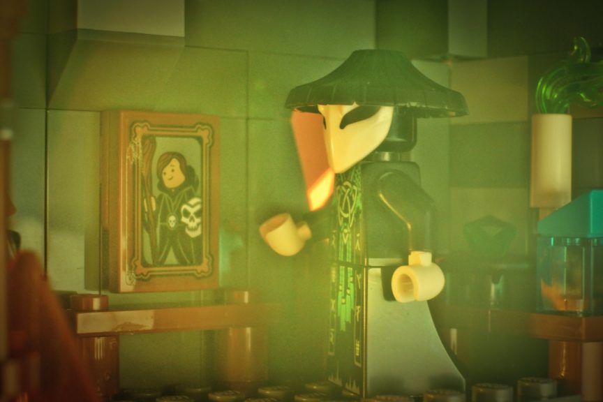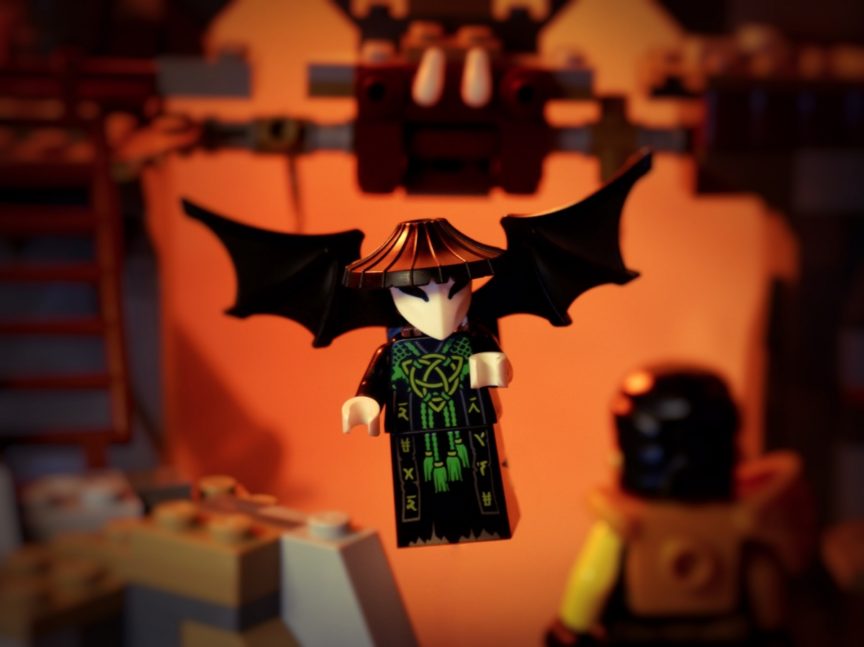 The “Big Bad” for this series is the titular Sorcerer. The design of this figure is fantastic. I love the green details on the torso and legs. I normally prefer actual legs to robes since they are better for posing but the “skirt” piece works really well. I especially love the dual moulded mask and hat piece; it has a really creepy look to it that gives me Plague Doctor vibes. The wings really round his look out nicely. In several shots of the Sorcerer I used a green gel because I thought it helped set a magical and slightly sinister tone. Out of all the minifigs in the set this one was most fun to shoot.