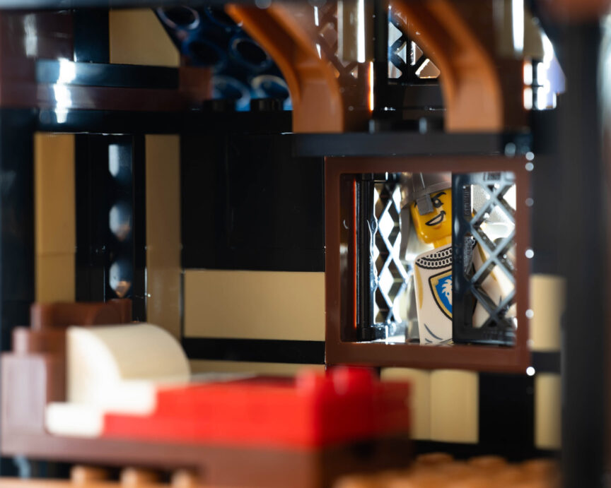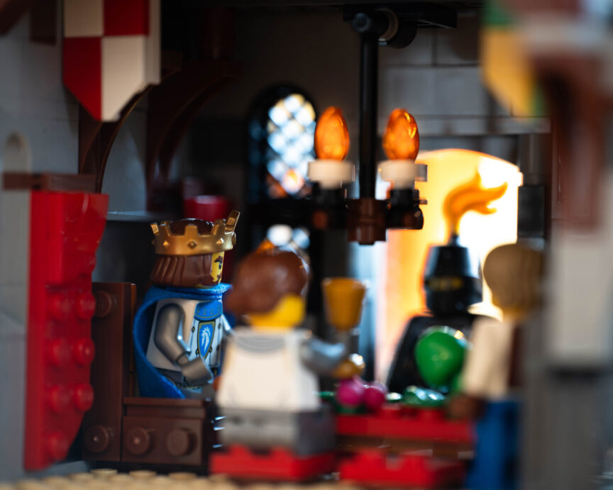 The main balcony is one of the details that I really like. It’s a great place for the King to stand and wave at his subjects. I also really like the stairs in the main tower. When I was a kid and I would build LEGO castles I would always build lots of stairways. Underneath the stairs there is also a hidden hollow to hide the treasure chest. The dining hall is also a very nice place for for the King and his Knights to gather. The throne is a nice little build and the King can sit in it even with his cape and crown on which is excellent. The chandelier, the tapestries, candles and the other details makes the dining room the most detailed and coherent room.