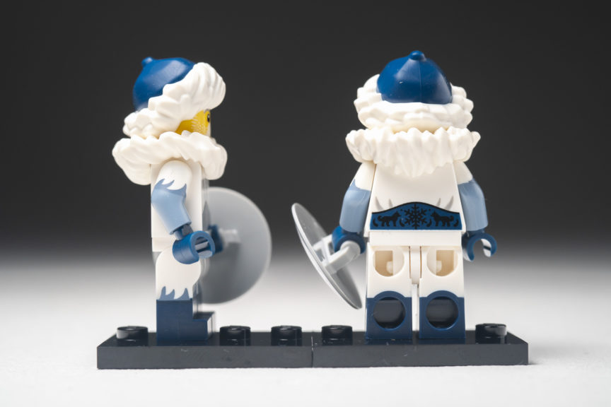 There’s some more white fur printed on the arms and the legs of the minifigure. The dark blue belt is detailed with huskies and snowflakes.