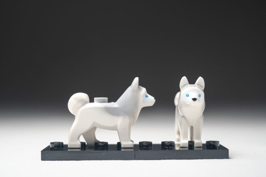 A blue-eyed husky with a light bley coat is the Snow Guardian’s companion. The other white husky LEGO made previously had black eyes and a dark bley coat.