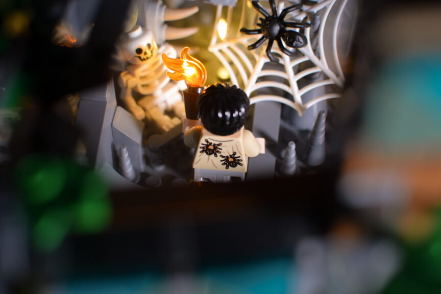 The archaeologist professor is wearing his famous hat, it’s a brand new piece, it’s similar to Woody’s hat (Toy Story) or Rex’s (The Lego Movie 2). The figurine is rather well done with a well-detailed torso and pants. It also has a whip and a small shoulder bag. His head has a double face, on one side a small classic smile and on the other side, his face is covered with spider web.