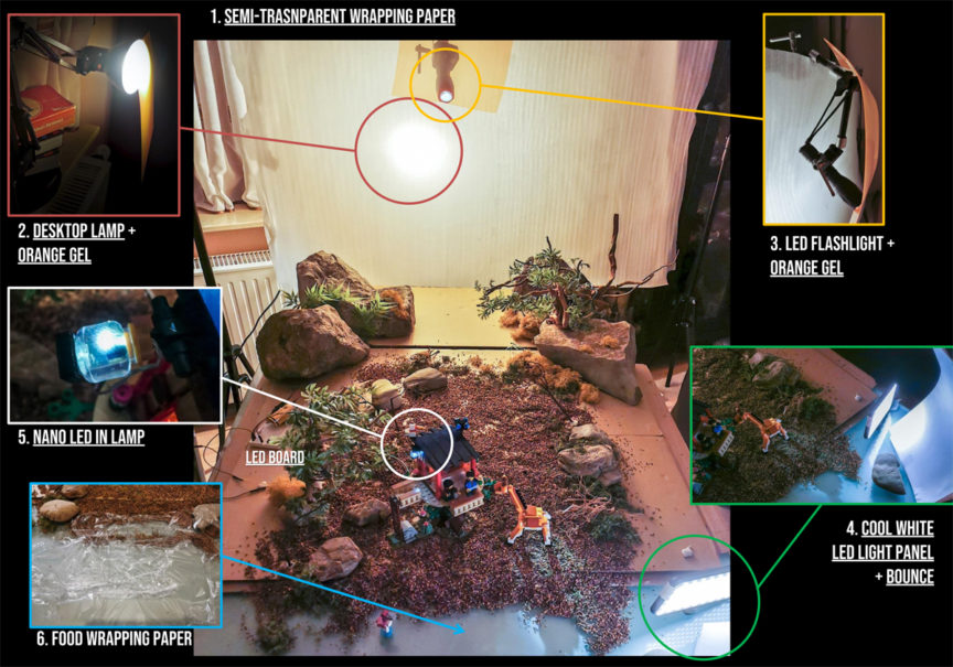 For both shots I used a semi-transparent wrapping paper (1) (this came with furniture, perhaps IKEA glass cabinets), which I hung on a studio background support. I lit up a desktop lamp with a RBG LED bulb, which was set to dark orange (2). I then supplemented lighting on the hairline of some elements (house, people’s heads, the giraffe) using a powerful LED flashlight (3) fixed to the background support suing a Small Rigs clamp. This was aligned to more or less the line of the desktop lamp, slightly above not to appear in the picture frame.