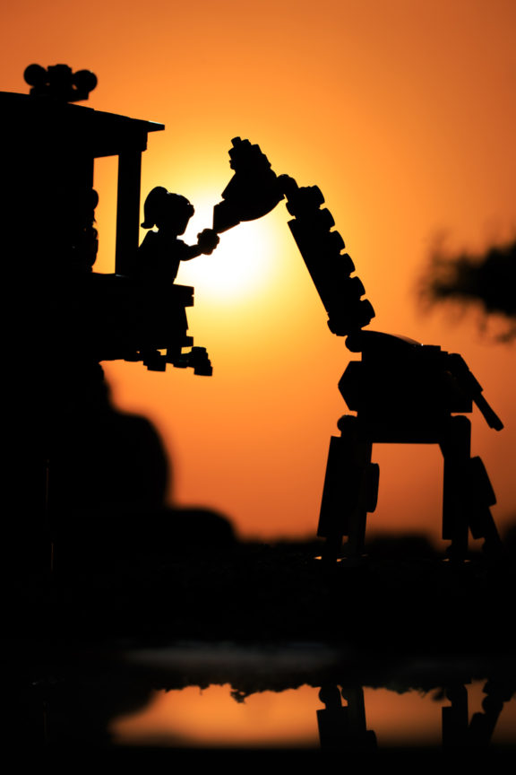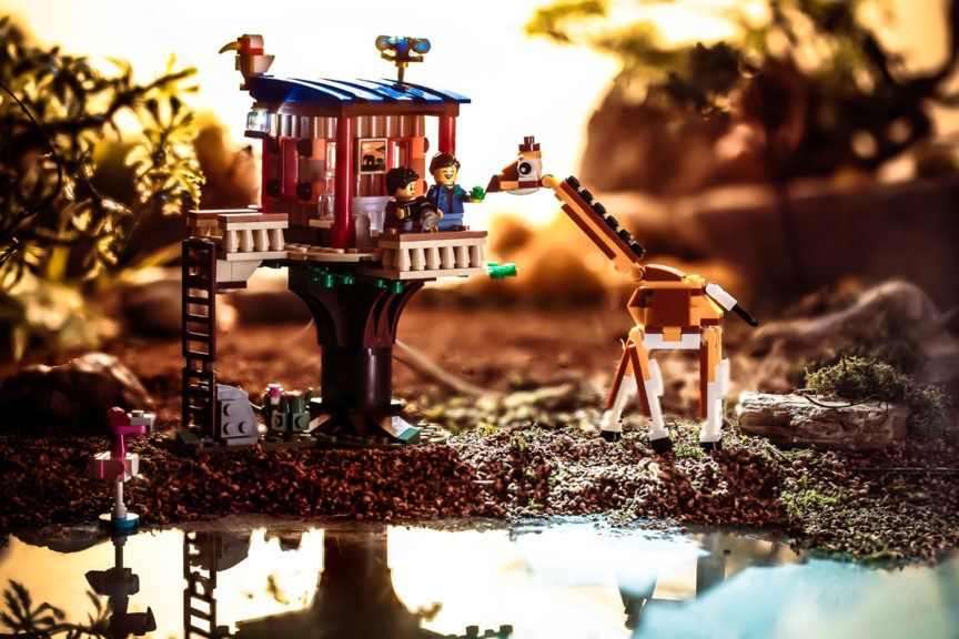 One very positive feature is the brick-built giraffe. It looks convincing and is the star of the set. Looking at it, I couldn’t help but wonder if we’ll ever get other wildlife brick-built animals (elephants, hippos, tigers, lions). Anyways, I did some shots in the same style as the picture frame, a silouhette against a sunset. An easy classic.