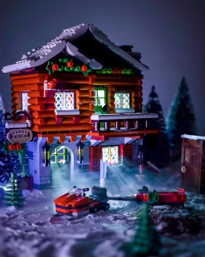 I made sure to position myself in front of a white wall which helped me a lot to simulate a winter landscape. I lit the interior of the chalet and positioned my LED panel on the left of the stage to have side lighting simulating the moon.