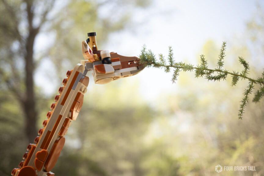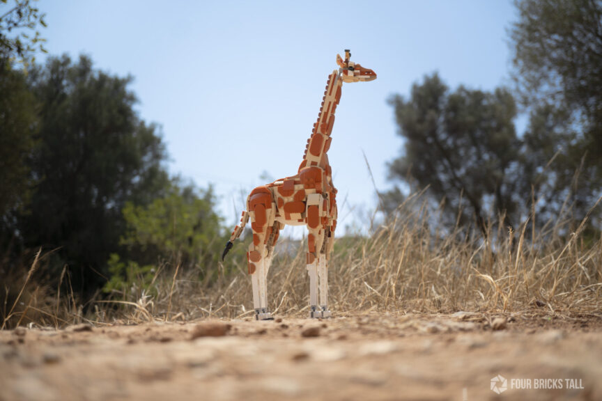 The giraffe is quite imposing at 14.5 in. (30 cm) high. It’s not minifig-scale—none of these models are—but that didn’t stop me from trying. I brought along a modified Safari Off-Roader 60267 for the photo shoot to see if I could get some fun photos of them together.